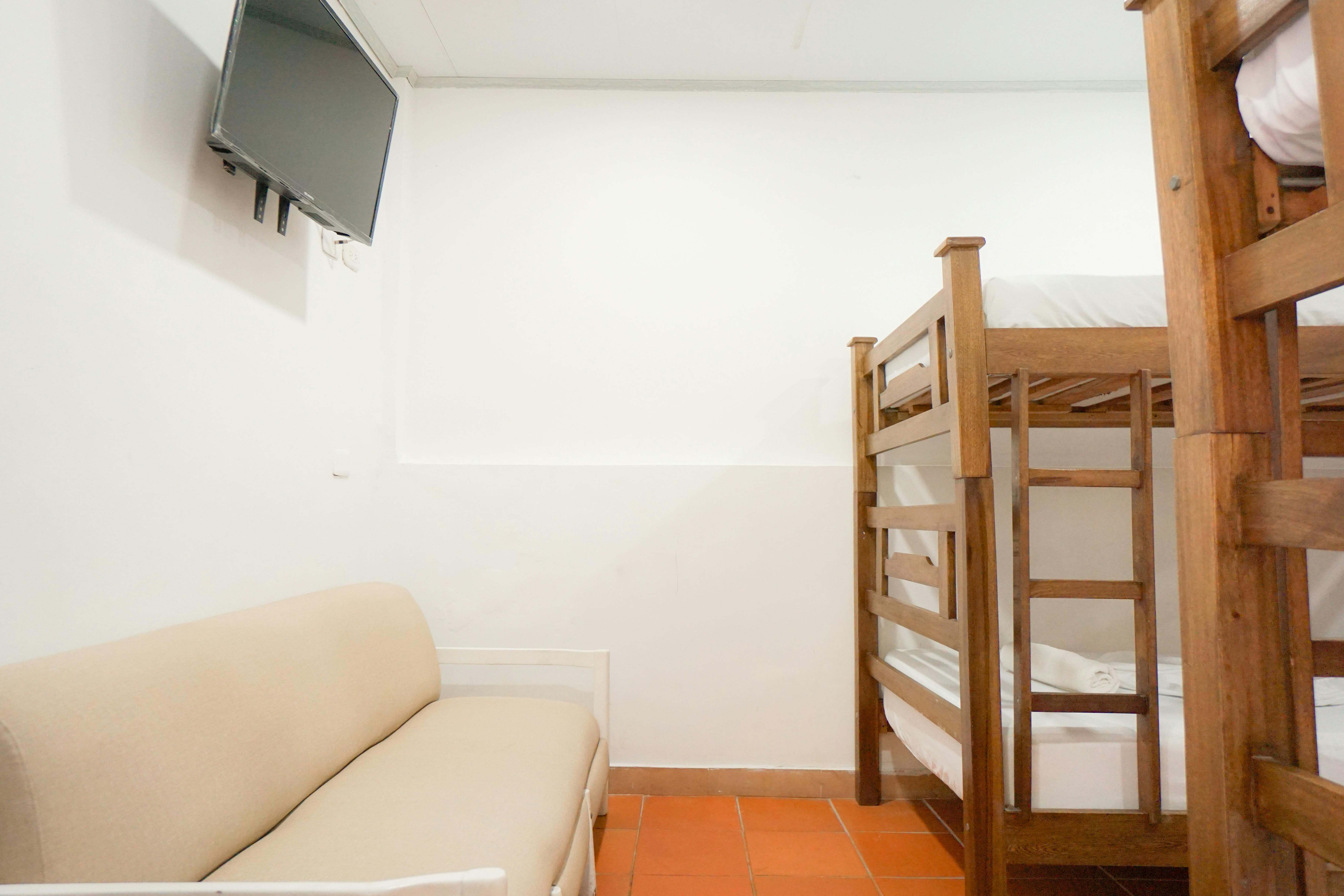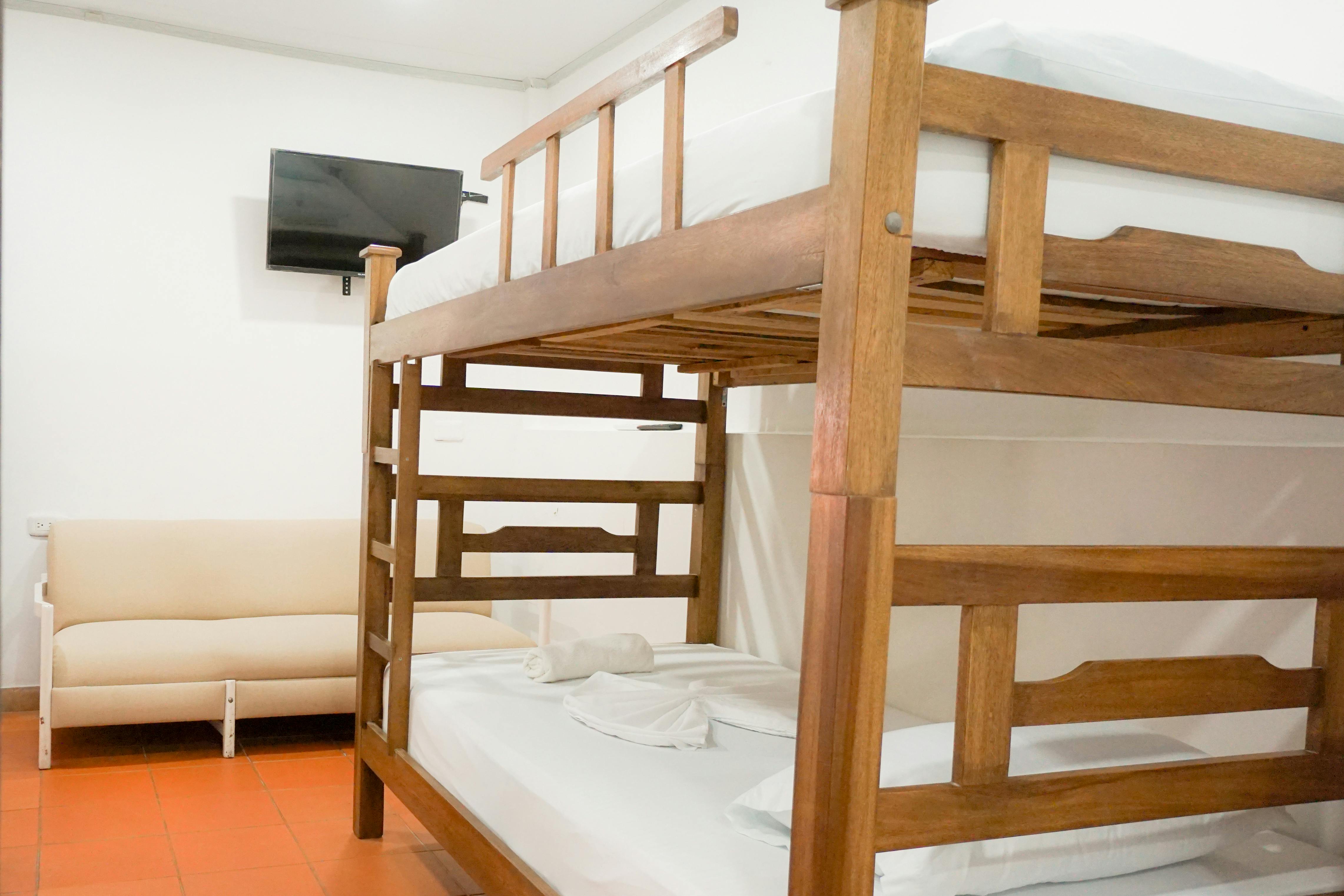 Ideal for families seeking the comforts of home in a beachside retreat, this spacious studio accommodates up to 6 people. It features two separate sleeping areas: a bedroom with a double bed and a second room with four bunk beds. Perfect for families who prefer to prepare their own meals, the studio includes a fully equipped private kitchen and a private outdoor terrace with a dining area. Enjoy air conditioning, a private bathroom, and a 32” flat-screen TV. Stay connected with high-speed broadband and free Wi-Fi.