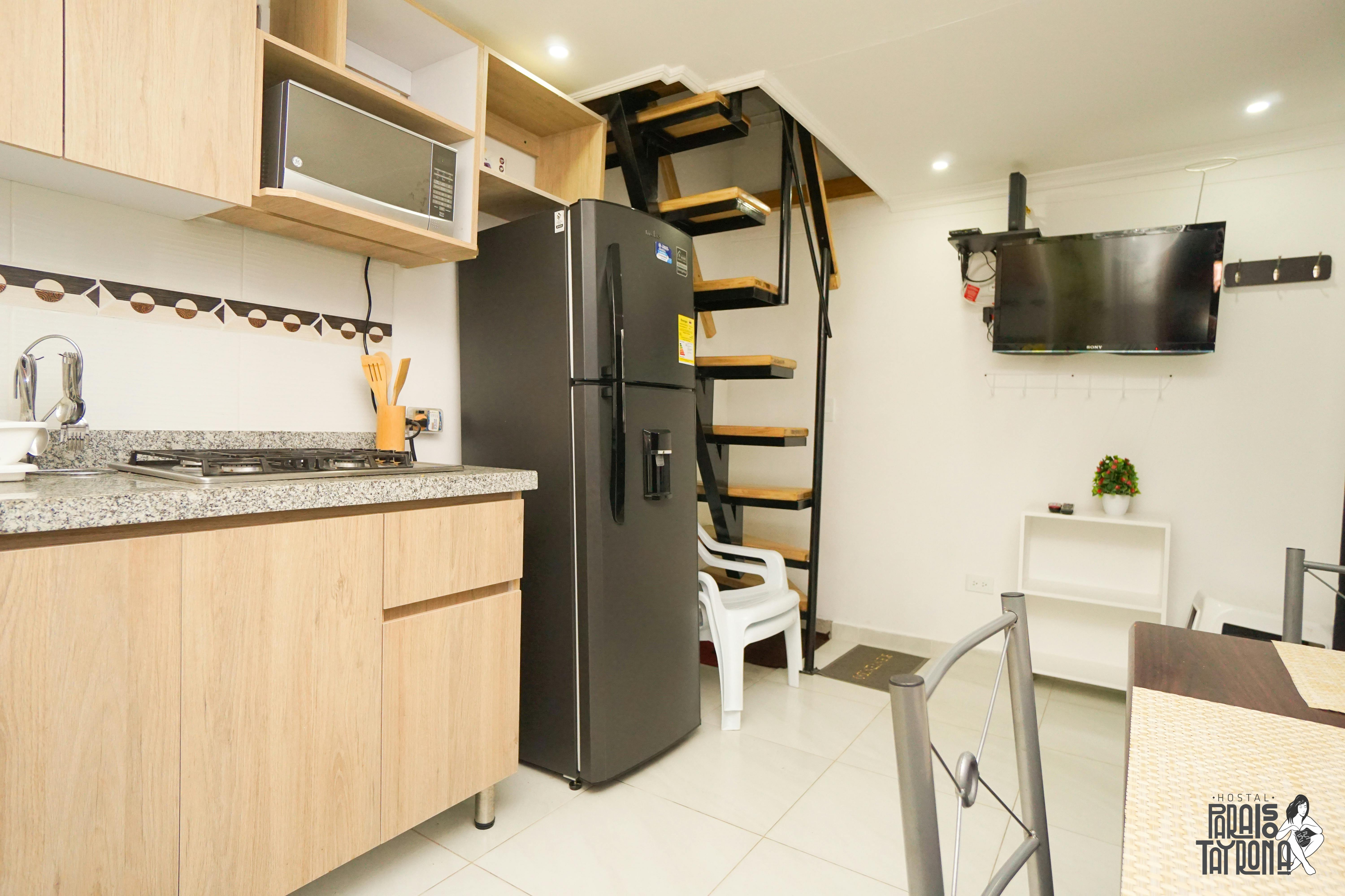 Enjoy an independent stay in this fully equipped duplex studio, located outside our hostel, in the exclusive Salguero Beach district—just one block from the sea. This peaceful neighborhood offers a luxurious retreat away from the noise, yet close to the beach. The studio features a dining area, laundry room, kitchen, air conditioning, and a 32” flat-screen TV with cable. Upstairs, you’ll find a comfortable bedroom with two double beds.